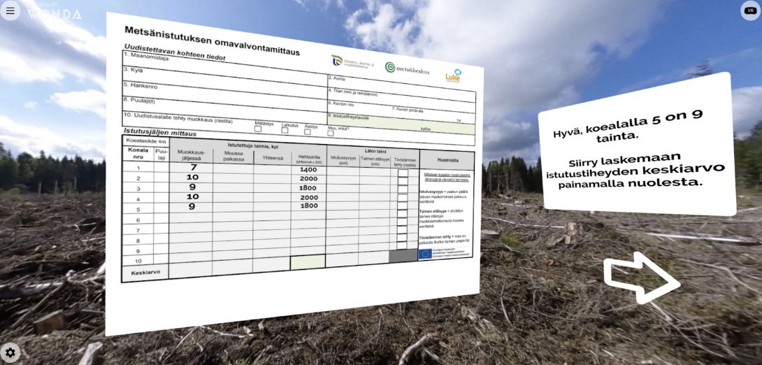 VR-harjoitus alkaa koealojen pinta-ala laskennalla, minkä jälkeen siirrytään istutusalueelle. Opiskelija voi edetä pinta-alalaskuissa kohta kohdalta tukea saaden. Tehtävässä opiskelija pääsee myös haastamaan itseään ja kokemaan onnistumisia “Jee, pääsin läpi! Hyvä fiilis.”