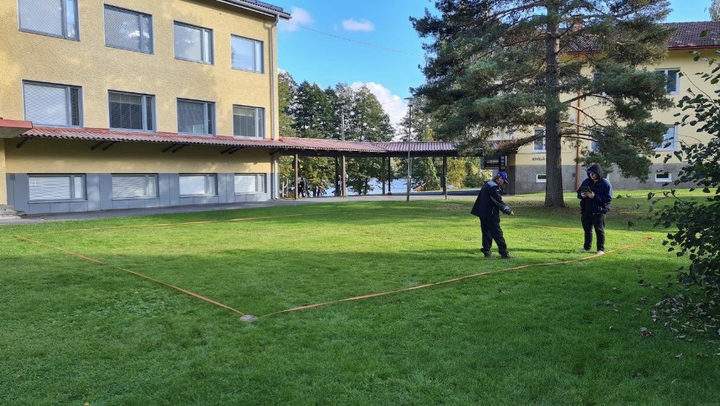 Kuvassa opiskelija on hahmottanut aarin mitat nurmikolle ja seuraavaksi on luvassa taimien istutustyö AR:n avulla. Opiskelijatestaukset vahvistivat, että tehtävä auttaa lisäämään ymmärrystä aarin koosta sekä pinta-alan muutoksista.