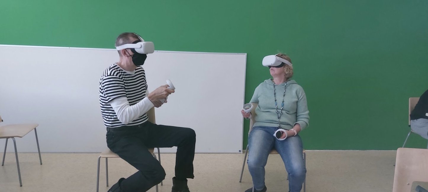 Opettajat testaamassa VR-laseja. Kehitettyjä vr-harjoitteita voidaan käyttää vr-lasien lisäksi tietokoneella tai puhelimella.