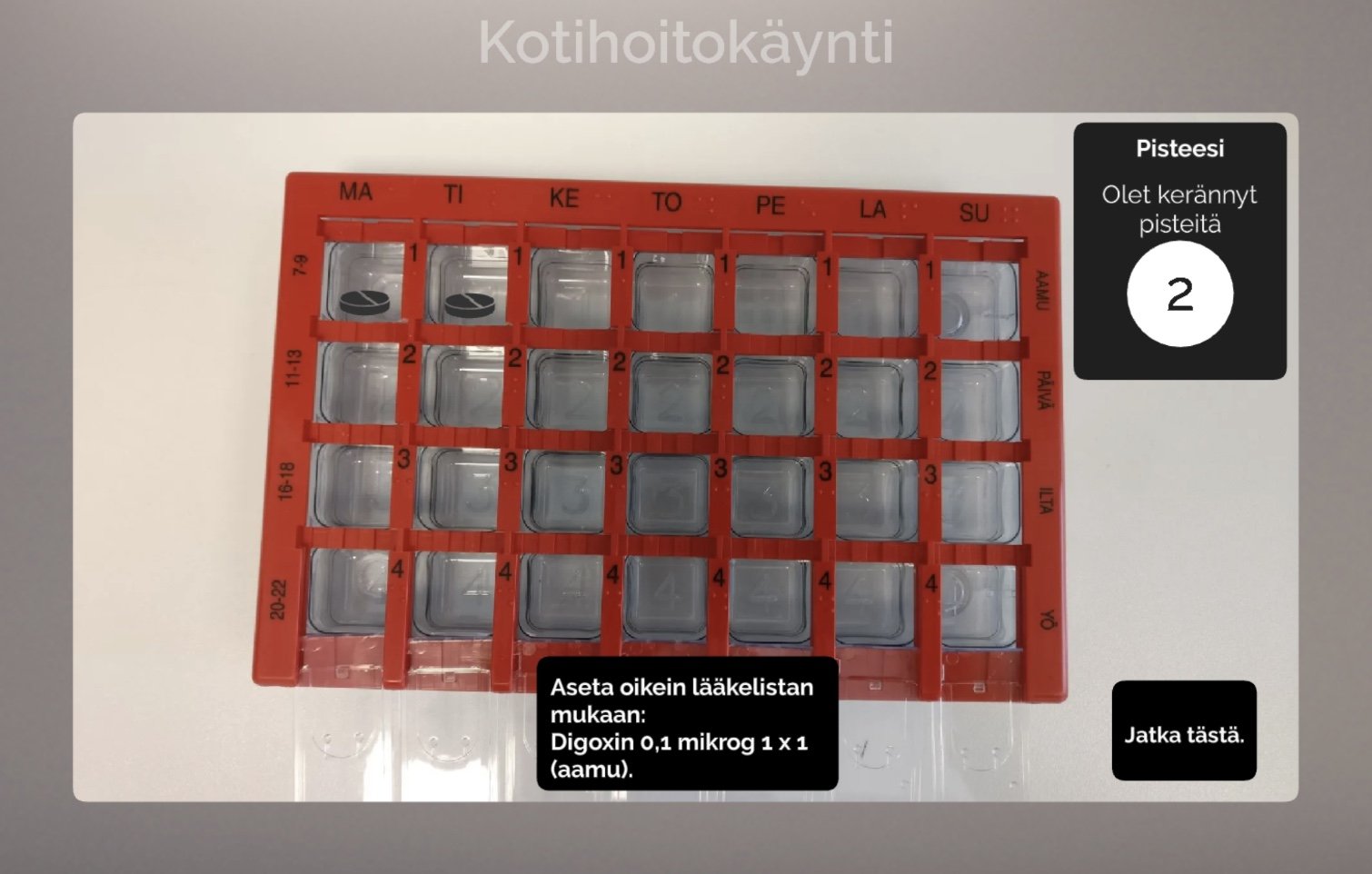 Johanna Kaittola, a social and health care teacher who participated in the joint development of VR content, describes her experiences: “Through the game, the student gets a glimpse into the world of home care in a practical way and by combining different things studied in theory. Areas of home care such as e.g. planned activities, observation of the client's state of health and functional capacity, nutrition monitoring, medication, asepsis and matters related to recording can be studied alongside traditional methods also by playing. Teaching is also varied in this way and things are concretized into practical tasks in the game at a completely different level than in traditional classroom teaching. Students have experienced the game as an interesting and new way of studying. Especially when you can play the game with VR glasses instead of the browser version, the experience is quite amazing.”